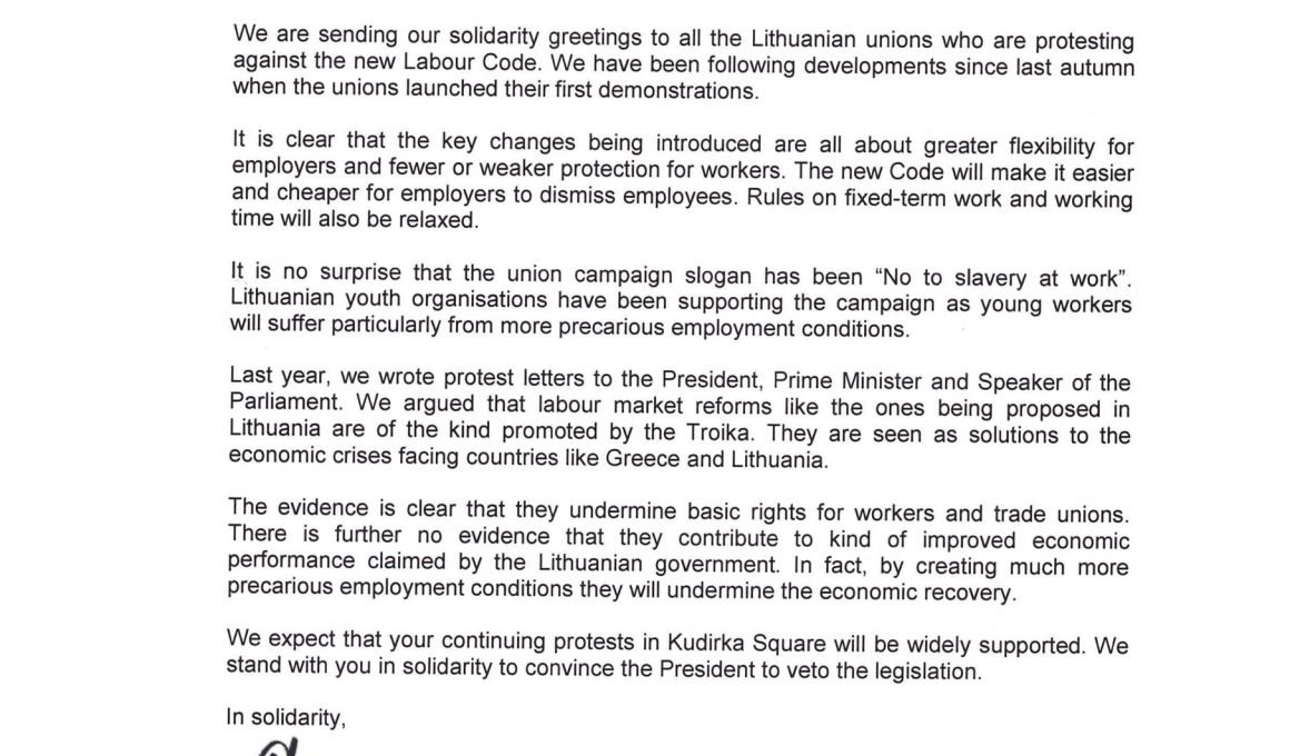 Pernai rašėme protesto laiškus LR Prezidentei, Ministrui Pirmininkui ir Seimo Pirmininkei. Juose teigėme, kad darbo rinkos reformos, rengiamos Lietuvoje, yra panašaus pobūdžio, kokios buvo siūlomos garsiojo Trejeto („Troikos“) krizės Graikijoje atveju.