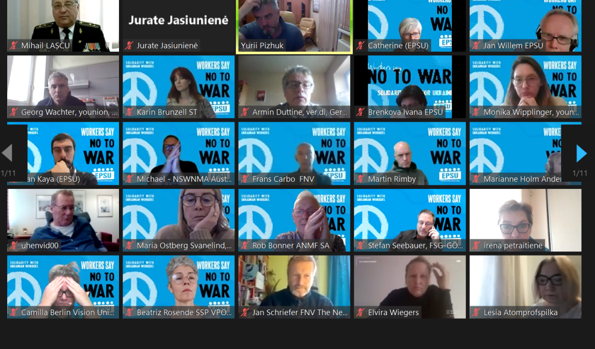 Šiandien vyko susitikimas su kolegomis iš Ukrainos profesinių sąjungų. Šį nuotolinį susitikimą organizavo Pasaulinė viešųjų paslaugų profesinė sąjunga (PSI) ir Europos viešųjų paslaugų profesinių sąjungų federacija (EPSU). Jame dalyvavo per 260 profesinių sąjungų atstovų.