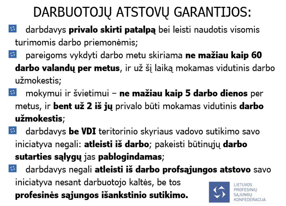 Valstybinės darbo inespekcijos (VDI) kancleris Šarūnas Orlavičius pažymi, kad darbdavio lygmeniu veikiančių profesinių sąjungų valdymo organams, darbo tarybų nariams, taip pat darbuotojų patikėtiniui turi būti sudaromos tinkamos jų veiklos sąlygos. Darbo kodekso nuostatos numato minimalias veiklos garantijas darbuotojų atstovams, kurias privalo suteikti darbdavys.