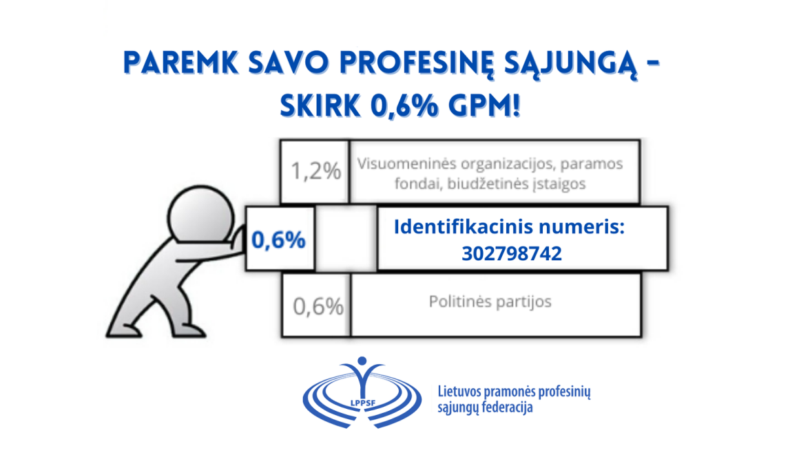 Deklaruodami pajamas už 2023 metus nepamirškite skirti 0,6 proc. nuo savo praėjusiais metais sumokėto gyventojų pajamų mokesčio (GPM) ir Lietuvos pramonės profesinių sąjungų federacijai (kodas – 302798742).