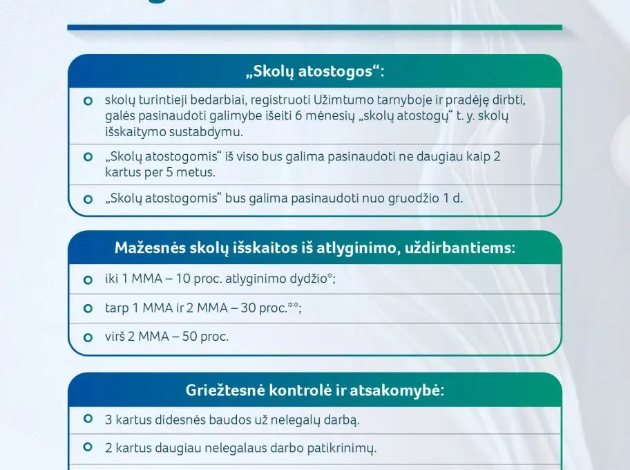Skolų turintys bedarbiai, pradėję dirbti, galės pasinaudoti vadinamosiomis „skolų atostogomis“, tai yra laikinai sustabdyti išieškojimą, o išskaitos iš atlyginimo bus mažesnės nei iki šiol, taip skatinant žmones dirbti legaliai. Be to, numatyta griežtesnė nelegalaus darbo kontrolė ir didesnės baudos už pažeidimus. Tokioms Socialinės apsaugos ir darbo ministerijos (SADM) parengtoms pataisoms šiandien pritarta Seime.