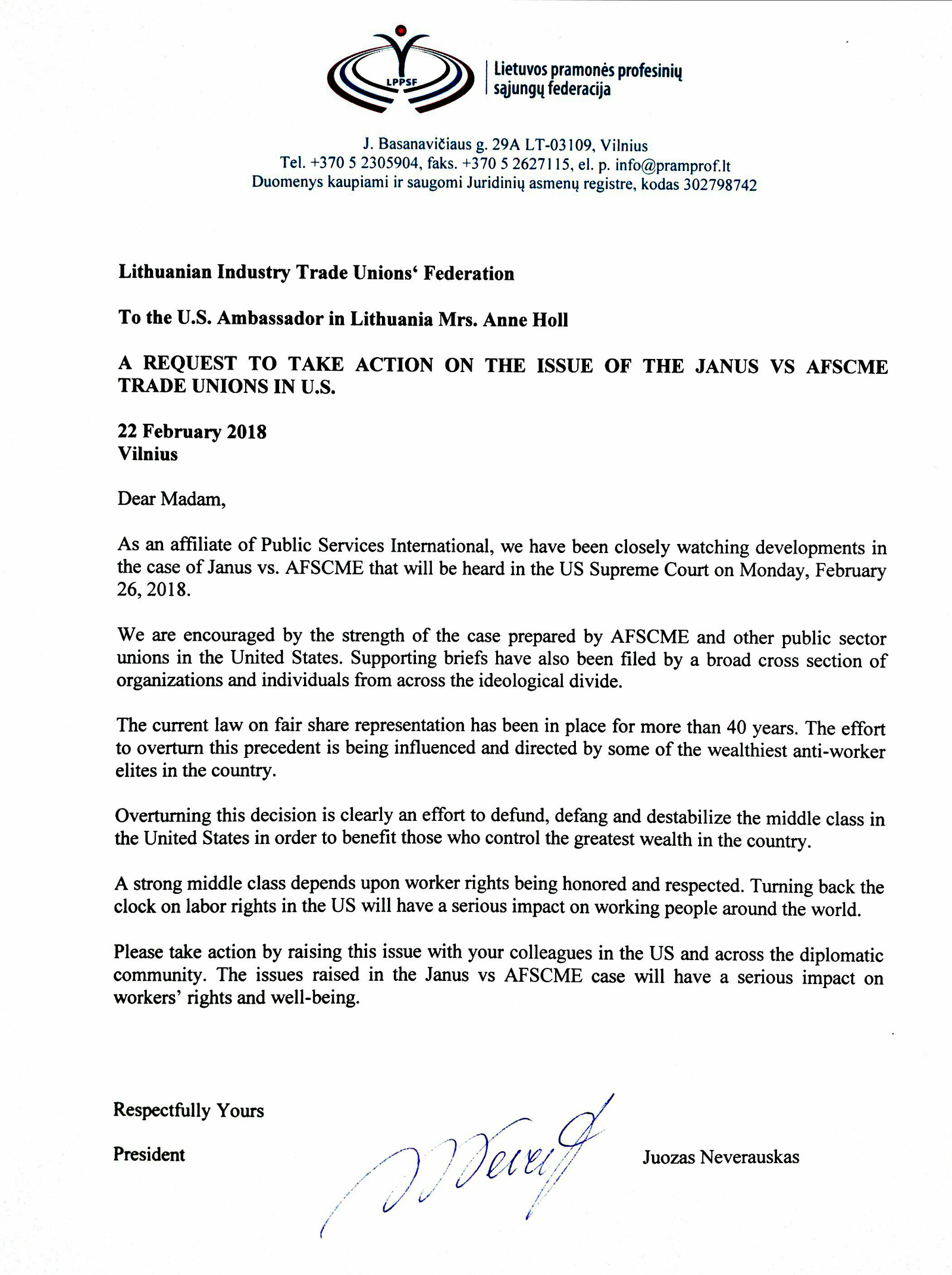 On 22 February President of the Lithuanian Industry Trade Unions’ Federation (LITUF), Juozas Neverauskas, sent a letter to the U.S. Ambassador in Lithuania, Mrs. Anne Holl regarding the issue in the Janus vs AFSCME case.