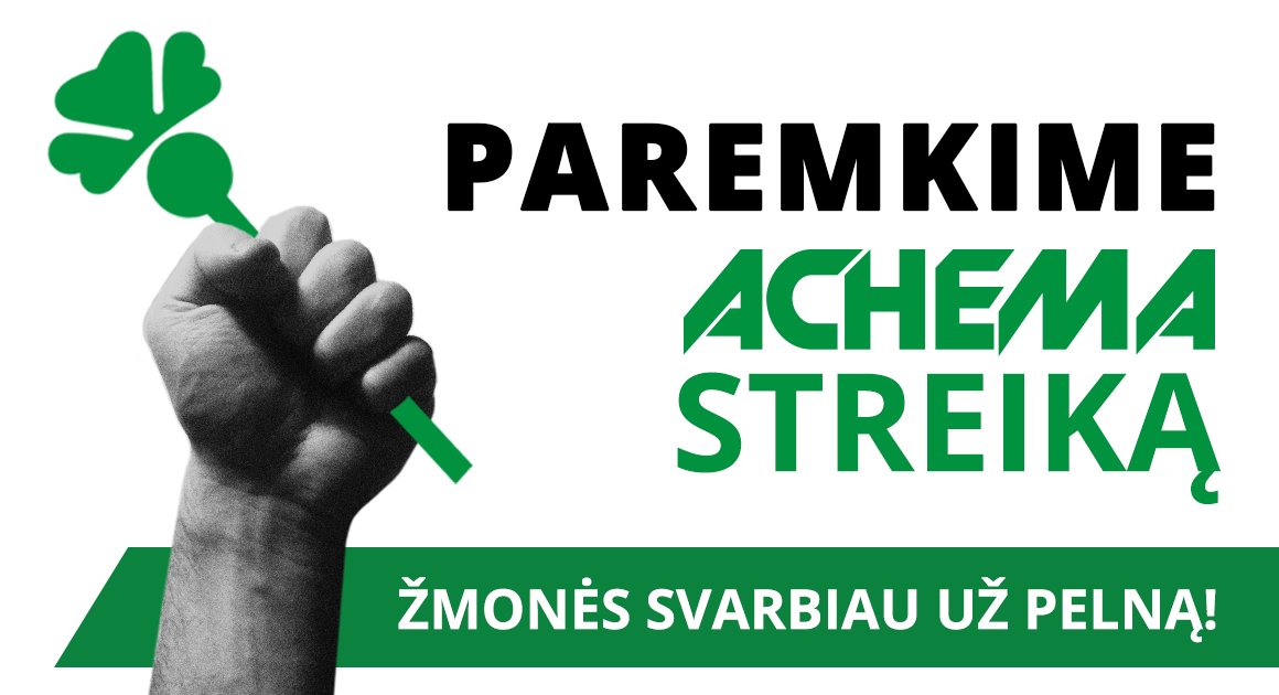 We call all those who are willing and are able to contribute to the fight of the „Achema“ workers by transferring funds to the following account of the Achema Workers’ Trade Union (Achemos darbuotojų profesinė sąjunga):
