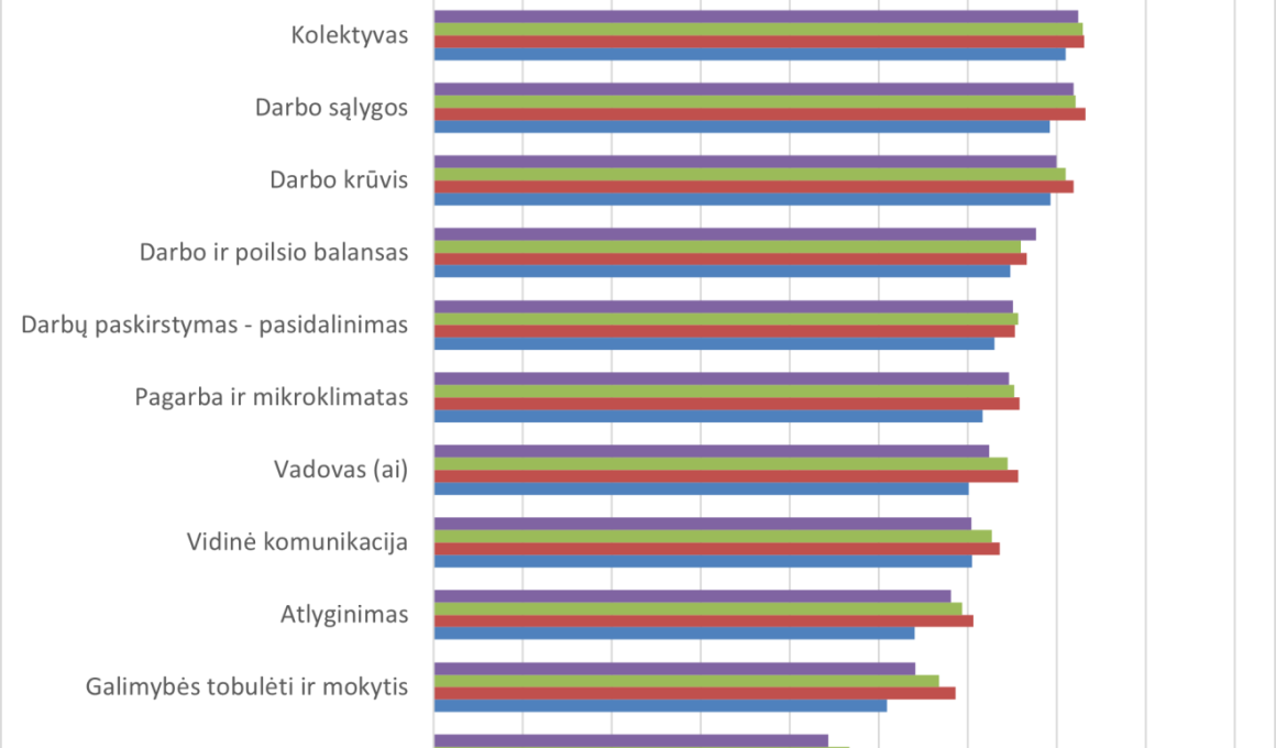 Palyginus su 2022 metų apklausos duomenimis, šiemet geriau nei pernai buvo įvertinti vos du veiksniai: darbo priemonės ir įrankiai – 7,28 (pernai – 7,22 balo) bei darbo ir poilsio balansas – 6,77 (pernai – 6,6 balo).