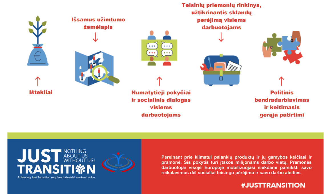 Manifestas yra pramonės darbuotojų raginimas politikos formuotojams visoje Europoje užtikrinti perėjimą prie ekologiškos, VISŲ darbuotojų atžvilgiu sąžiningos ekonomikos, kuri ne griauna, o išsaugo ir kuria kokybiškas darbo vietas. Siekiama, kad perėjimas būtų skaidrus, o dėl visų procesų būtų deramasi su darbuotojais ir juos atstovaujančiomis organizacijomis, per jų aktyvų įtraukimą į visus teisingo perėjimo prie žaliojo kurso įgyvendinimo etapus, apimant veiksmingą politikos planavimą, skatinant ir stiprinant darbuotojų teises,socialinį dialogą bei teisingą lėšų paskirstymą.